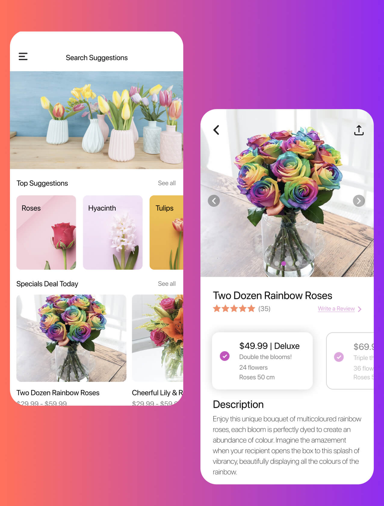 The app was designed to enable the flowers to be the main focus of the app. The clean white user interface enabled this to work in great balance with the photos of the flowers.