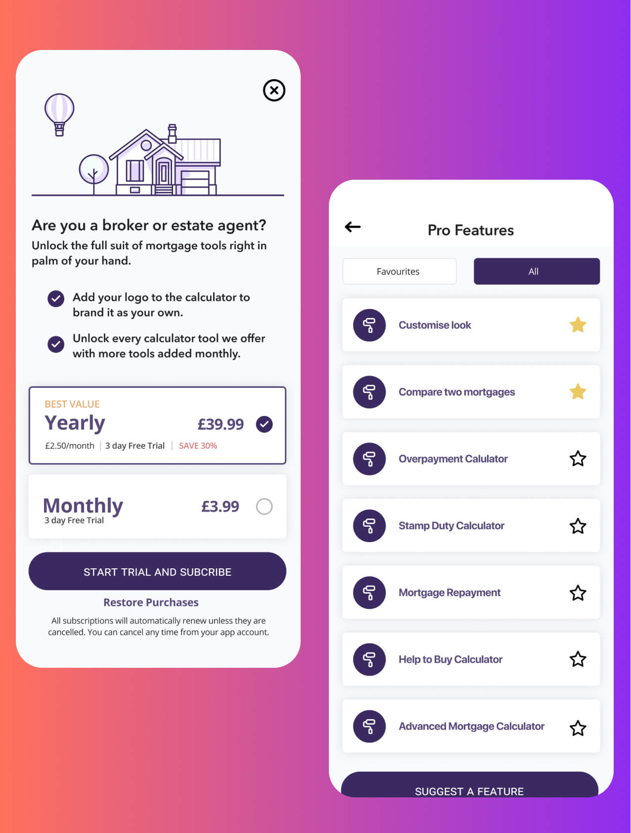 This was the biggest challenge in making the app useful for the mortgage brokers and estate agents, so a subscription mode was decided on to allow all the extra tools that would make their lives easier based on the feedback that was given.